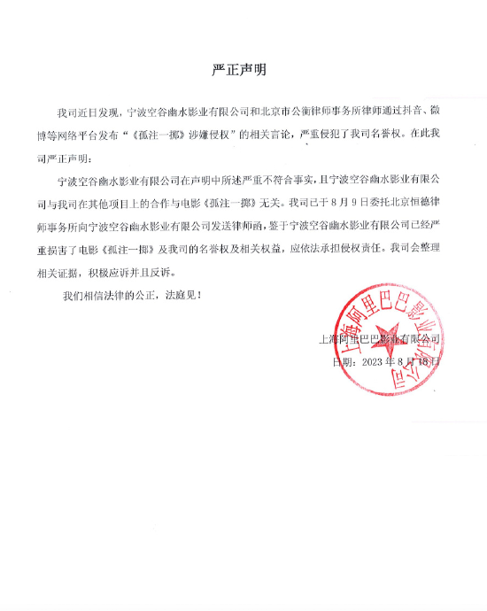 针对电影《孤注一掷》涉嫌侵权一事,阿里影业发布声明称,宁波空谷幽水影业有限公司(以下简称“宁波空谷幽水影业”)所属严重不符合事实,且宁波空谷幽水影业与阿里影业在其他项目上的合作与《孤注一掷》无关。阿里影业已于8月9日委托律师事务所向其发送律师函。阿里影业称,鉴于宁波空谷幽水影业严重损害了《孤注一掷》及阿里影业的名誉权及相关权益,应依法承担侵权责任,阿里影业会整理相关证据,积极应诉并且反诉,“我们相信法律的公正,法庭见!” 今日下午,《孤注一掷》出品方之一坏猴子影业也发布声明称,剧本是由导演编剧合力,取材众多真实事件原创完成的,剧本完整知识产权归属坏猴子公司享有。《孤注一掷》投资方之一阿里影业与空谷幽水公司的项目合作和争议和本片无关,将由阿里影业负责处理解决。 昨日晚间,宁波空谷幽水影业在微博上发布声明称,《孤注一掷》涉嫌侵犯自己公司原创系列电影《捕鱼行动》的版权,已向国家电影局举报并提起诉讼。 截至发稿,《孤注一掷》累计票房达到23.21亿元,在暑期档影片中总票房排名第二。